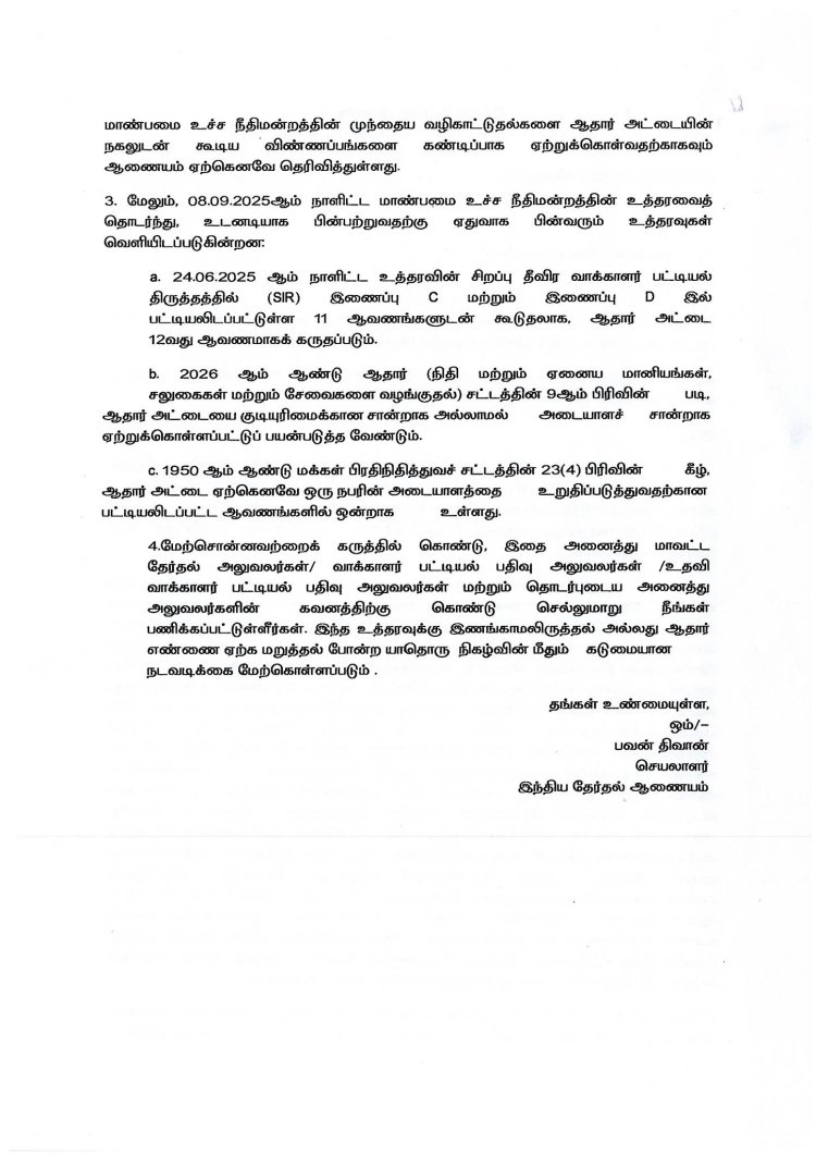 ஆதார் அட்டைக்கு இந்தியத் தேர்தல் ஆணையத்தின் கடித எண் 23/2025-ERS/Vol.II நாள் 09.09.2025இல் (இணைப்பு II) வெளியிடப்பட்ட அறிவுரைகள் பொருந்தும்.