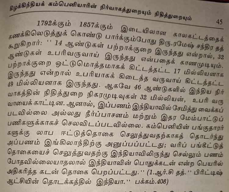 "அதாவது 1792 முதல் 1857 வரை இந்திய நிர்வாக நிதித்துறை மூலமாக கிடைத்த உபரி வருவாயான 32 மில்லியன் பவுண்டு பணத்தை , கம்பெனியின் பங்குதாரர்களுக்கு லாபமாக இங்கிலாந்திற்கு அனுப்பப்பட்டது" என்றும்