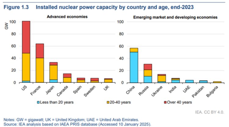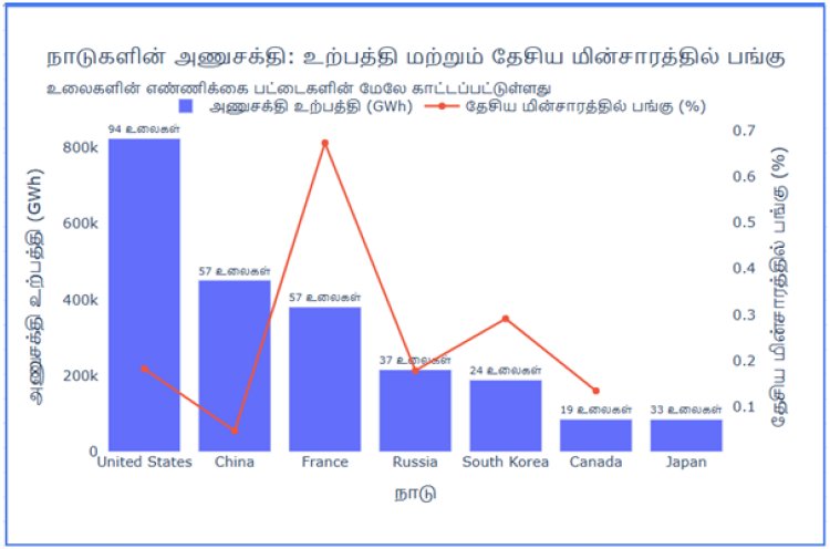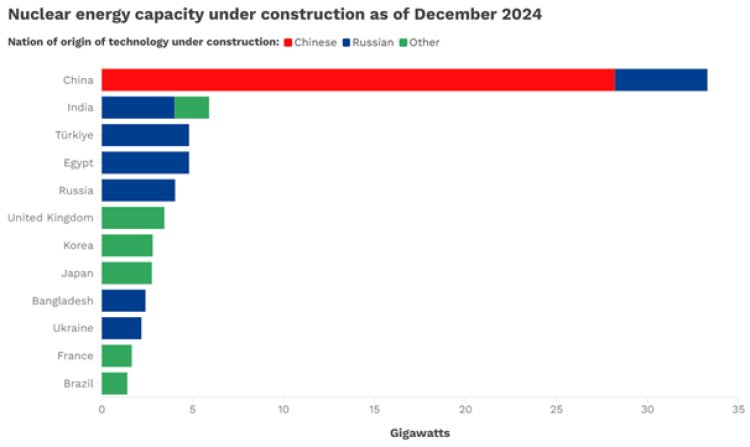 கொடுக்கப்பட்டுள்ள படத்தின் படி அமெரிக்க முன்னிலையில் உள்ளபோதும், கடந்த 50 வருடங்களாக புதிய அணு உலை கட்டுமானங்களில் அது கவனம் செலுத்தவில்லை. அது மட்டுமல்லாமல் அனைத்து வளர்ந்த நாடுகளின் நிலையும் ஒப்பீட்டளவில் ஒரே மாதிரியாக பெரிய அளவில் முன்னேற்றமில்லாமல் உள்ளது. அதேபோது ஒப்பீட்டளவில் இரசியா மூன்றில் ஒரு பங்கு புதிய கட்டுமானங்களை பெற்றுள்ளது. ஆனால் சீனாவை நோக்கும்போது, இத்துறையில் அசுர வளர்ச்சி பெற்றுவருகிறது. குறிப்பாக அடுத்த 5 ஆண்டுகளில் அணு ஆற்றல் துறையில் அமெரிக்காவை மிஞ்சிவிடும் என்று கணிக்கப்பட்டுள்ளது. ஏனென்றால், புதிய கட்டுமானங்கள் பலவும் நடைமுறைக்கு வரவுள்ளன. கொடுக்கப்பட்டுள்ள படத்திலிருந்து நாம் அதை கவனிக்க முடியும். இரசியா மற்ற நாடுகளில் அணு உலை அமைப்பதில் முன்னணியில் உள்ளது.