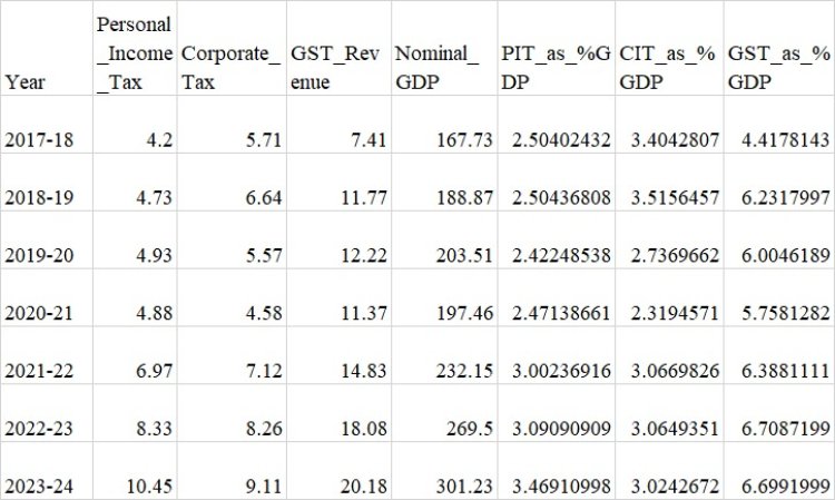 கொடுக்கப்பட்டுள்ள அட்டவணை நமக்கு தெளிவாகக் காட்டுவது என்னவென்றால், கார்ப்பரேட்கள் மீதான வரி 2017ம் ஆண்டில் 5.71 லட்சம் கோடியிலிருந்து 2024ம் ஆண்டில் 9.11 கோடியாக மாறியுள்ளது. அதே சமயம் தனிநபர் வருமான வரி 4.2 லட்சம் கோடியிலிருந்து 10.45 லட்சம் கோடியாகவும், ஜிஎஸ்டி வருவாய் 7.41 லட்சம் கோடியிலிருந்து 20.18 லட்சம் கோடியாகவும் - அதாவது மக்கள் மீதான மொத்த வரி 11.61 லட்சம் கோடியிலிருந்து 30.63 லட்சம் கோடியாக உயர்ந்துள்ளது. மொத்த உள்நாட்டு உற்பத்தியின் சதவிகிதத்தில் பார்த்தோம் என்றால் கார்ப்பரேட் வரி 3.5% சதவிகிதத்திலிருந்து 3.0% சதவிகிதமாக குறைந்துள்ளது. (2008ம் ஆண்டில் 6.3% சதவிகிதமாக இருந்த கார்ப்பரேட் வரி, ஜிஎஸ்டி வரி விதிப்புக்கு பின்பு 2017ல் 3.5% சதவிகிதமாக குறைந்தது என்பதும் இங்கு குறிப்பிடத்தக்கது). எனில் கார்ப்பரேட்களின் வரி பங்களிப்பு பாதிக்கும் குறைவாக குறைந்துள்ளது என்பதே அர்த்தம். மாறாக மக்கள் மீதான அநியாய வரி 6.9% சதவிகிதத்திலிருந்து 10.17% சதவிகிதமாக ஏறக்குறைய இருமடங்கு அளவுக்கு உயர்ந்துள்ளது என்பதை பார்க்க முடிகிறது.