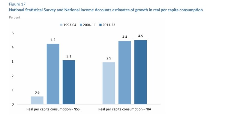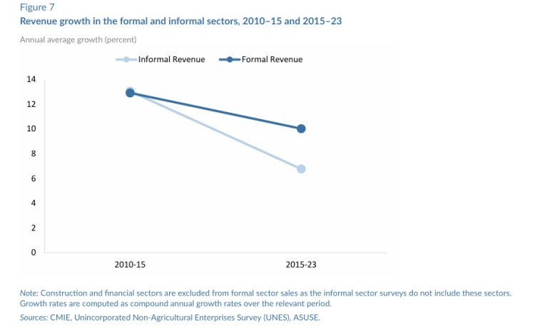 இந்த வேறுபாட்டிற்கான நேரடி ஆதாரங்களை ஆய்வறிக்கை வழங்குகிறது. இந்தப் பாதிப்புகளுக்குப் பிறகு, வருடாந்திர பெயரளவு வளர்ச்சி (nominal growth) முறைசார்ந்த துறையில் சராசரியாக 10.0 சதவீதமாகவும், முறைசாராத் துறையில் வெறும் 6.8 சதவீதமாகவும் இருந்தது. தேசிய வருமானக் கணக்குகள் (National Income Accounts) முறைசாராத் துறையின் வளர்ச்சி 9 சதவீதமாகக் காட்டினாலும், என்.எஸ்.எஸ் (NSS) ஆய்வுகள் அது 5.4 சதவீதம் மட்டுமே வளர்ந்ததாகக் கூறுகின்றன. முறைசாராத் துறை வெளிப்படையாகப் பின்தங்கியிருந்தாலும், ஜிடிபி கணக்கீட்டு முறை அதைப் பதிவு செய்யவில்லை.