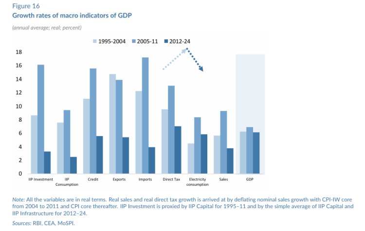 2016-ஆம் ஆண்டு பணமதிப்பிழப்பு சமயத்தில், கார்ப்பரேட் விற்பனை வளர்ச்சி வெறும் 1.4 சதவீதமாக இருந்தபோது, அதிகாரப்பூர்வ ஜிடிபி வளர்ச்சி 8.0 சதவீதமாகக் காட்டப்பட்டது. இவை சிறிய பிழைகள் அல்ல, மாறாக நிஜப் பொருளாதாரத்திற்கும் அதிகாரப்பூர்வ எண்களுக்கும் இடையே இருந்த பெரும் தொடர்பின்மையைக் காட்டுகின்றன.