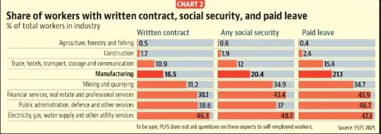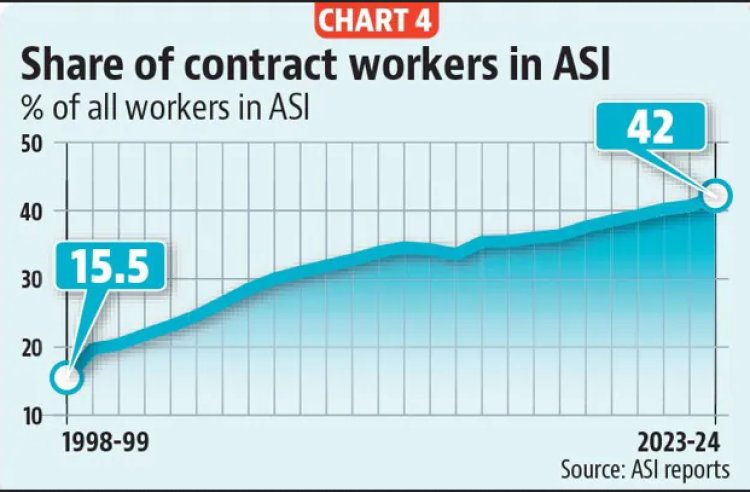 பதிவுசெய்யப்பட்ட உற்பத்தித் துறையை உள்ளடக்கிய தொழில்துறைகளின் வருடாந்திர கணக்கெடுப்பானது (ASI), ஒப்பந்ததாரர் மூலம் வேலைக்கு அமர்த்தப்பட்டவரை (எழுத்துப்பூர்வ ஒப்பந்தம் இல்லாவிட்டாலும் கூட) 'ஒப்பந்தத் தொழிலாளி' என வரையறுக்கிறது. இத்தகைய தொழிலாளர்கள், தொழிற்சாலையினால் நேரடியாக நியமிக்கப்பட்டவர்களை விடக் குறைவான ஊதியம் பெறுபவர்களாகவும், எந்தவித சலுகைகளும் அற்றவர்களாகவும் இருக்கிறார்கள். இந்த நூற்றாண்டின் தொடக்கத்திலிருந்தே இந்திய தொழிற்சாலைகளில் இத்தகைய ஒப்பந்தத் தொழிலாளர்களின் எண்ணிக்கை இரண்டு மடங்குக்கும் மேலாக அதிகரித்துள்ளது என்று ASI தரவுகள் காட்டுகின்றன: அதாவது 2000-01 இல் 20 சதவீதமாக இருந்தது; 2023-24 இல் அது 42 சதவீதமாக உயர்ந்துள்ளது.