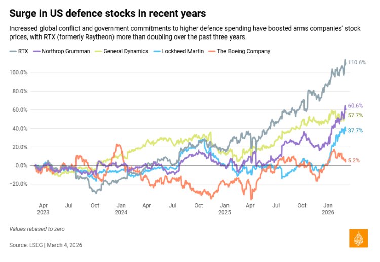 இவற்றின் பங்குசந்தை ஈரான் மீதான 2025 மே - ஜூன் மாத தாக்குதலுக்கு பிறகு தொடர்ச்சியாக உயர்ந்து வந்தாலும் கடந்த ஆண்டின் இறுதியில் லேசான சரிவை சந்தித்துள்ளன. இவற்றை ஈடுசெய்ய இவர்களின் வியாபாரத்தை அதிகரிக்க போர் நடக்க வேண்டும். அதன் ஒரு பகுதியாகத்தான் ஈரான் மீதான போரில் இந்த அம்சமும் முக்கிய பங்காற்றுவதாக நாம் பார்க்கிறோம். ஈரான் மீதான போர் முயற்சிகள் மற்றும் பிப்ரவரி 28 தாக்குதல்களுக்கு பிறகு உடனடியாக, லாக்கீடு மார்ட்டீன், நார்த்ரொப் க்ரும்மென், ஆர்டிஎக்ஸ், ஜெனரல் டைனமிக்ஸ் ஆகிய நிறுவனங்களின் பங்குச்சந்தை புதிய உச்சத்தை பெற்றுள்ளதை படம் -2ல் காணலாம்.