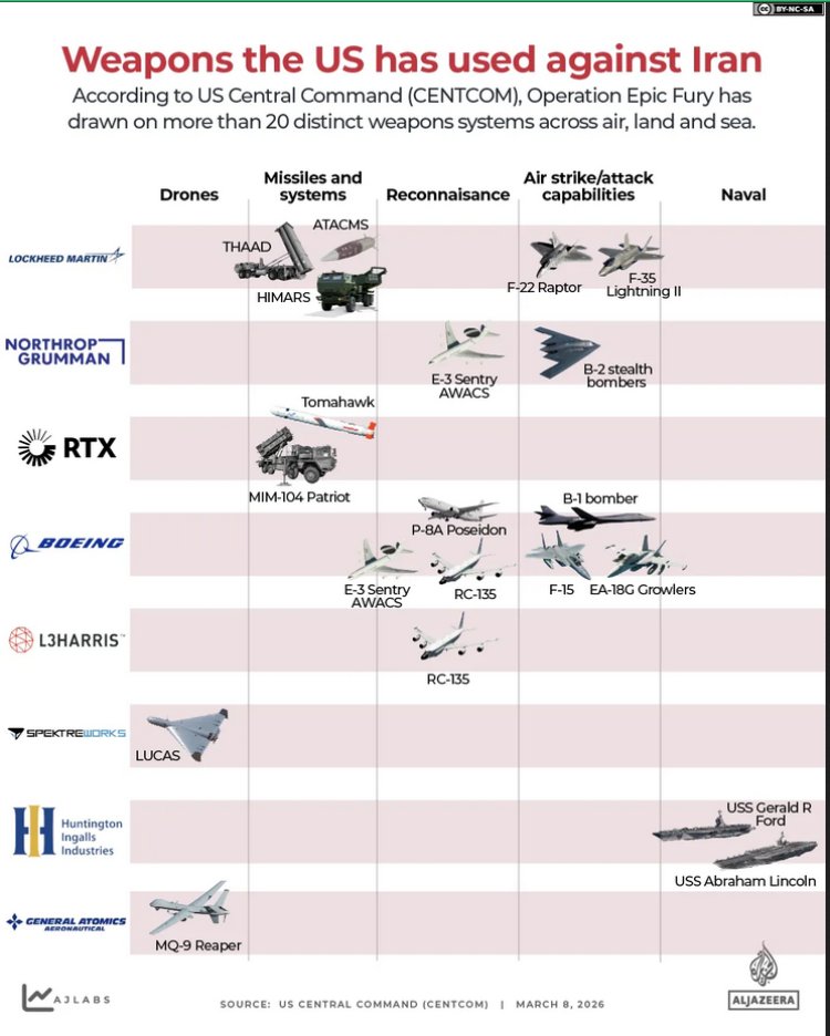 ஈரான் மீதான அமெரிக்க – இஸ்ரேலின் “ஆப்பரேஷன் எபிக் பியூரி” தாக்குதலில் படம் -1 ல் கொடுக்கப்பட்டுள்ள வகையான போர் விமானங்கள், போர்கப்பல்கள், டிரோன்கள் உள்ளிட்ட ஆயுத தளவாடங்கள் பயன்படுத்தப்பட்டுள்ளன. இவற்றை பட்டியலுள்ள அமெரிக்க ஆயுத கார்ப்பரேட்களே தயாரித்து விற்பனை செய்து வருகின்றனர்: